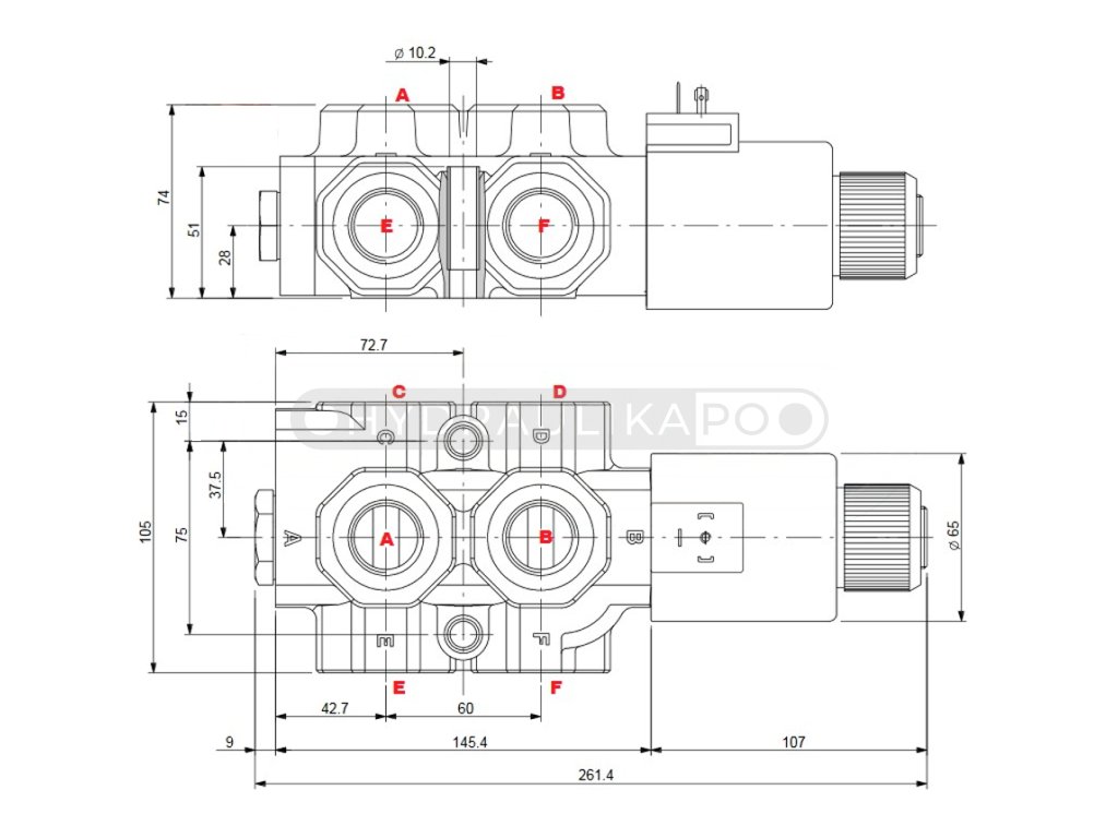 Hydraulická výhybka 6/2 cestný elektrohydraulický ventil s prietokom 140L/min ovládaný 12V od firmy Walvoil. Slúži na rozšírenie 2 - sekciového rozvádzača oládaného joystickom o 3. sekciu prípadne 4. sekciu (2 x hydraulická výhybka). 2 x vstup, 4 x výstup