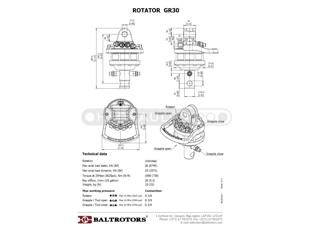 Hydraulický rotátor GR30 s maximálnou nosnosťou 3 T, určený na použitie v rôznych poľnohospodárskych a priemyselných zariadeniach ako sú vývozky, drapáky, nakladače, žeriavy a podobne. Je dodávaný s brzdou BRM10-60-01. Kvalitný a dlhoročný výrobca firma Baltrotors (Lotyšsko).