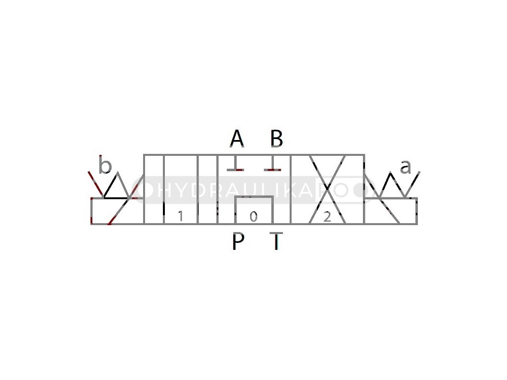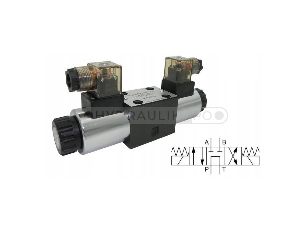 - Konfigurácia: dve cievky 24V DC, 3-polohový posúvač typu G stabilizovaný pružinou do polohy 0