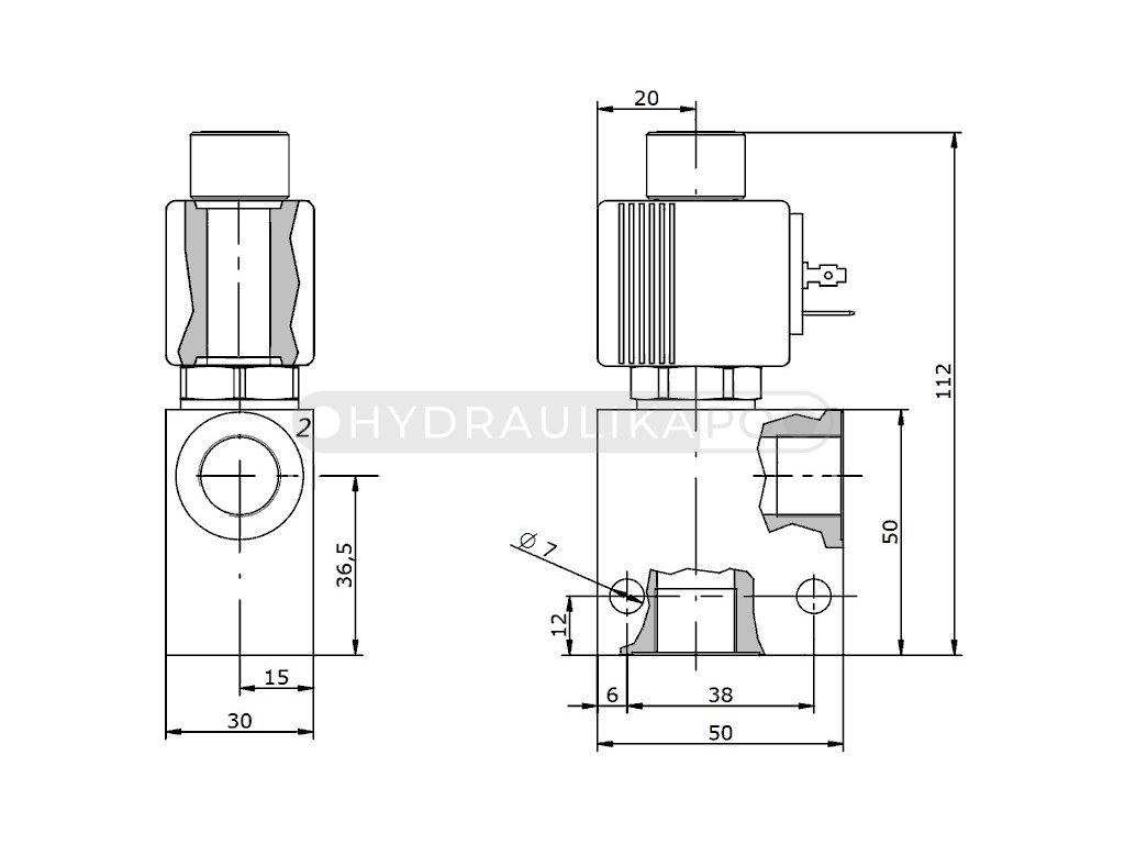 Hydraulický ventil ovládaný 24V s maximálnym prietokom 40 L/min. Bez napätia je prechod z portu 2 do 1 zatvorený rovnako ako prechod z portu 1 do 2. Ventil je blokovaný v oboch smeroch. Pri pripojení 24V sa prechod z portu 2 do 1 otvorí.